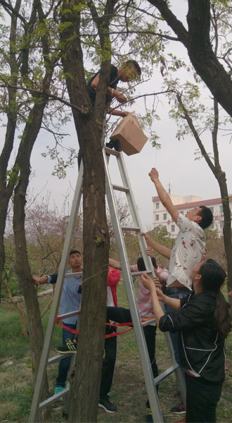 4月15日,来自6776永利集团16级的123名大学生、枣庄市渴口中心校30名小记者(少先队员)与家长、枣庄市第十一中学20余名师生携手开展以“关爱鸟类爱护自然和谐共处”为主题的“爱鸟筑巢”活动。此前,6776永利集团团总支组织16级大学生们利用课余时间,模拟大自然中的鸟巢构造,精心设计制作出各式各样的造型美观的鸟巢40多个。活动当天,在家长和老师们的协助下,同学们经过认真考察,将30个鸟巢分别安置到yl6776永利集团校园内不同方位的大树上,为鸟儿们筑起爱巢。
