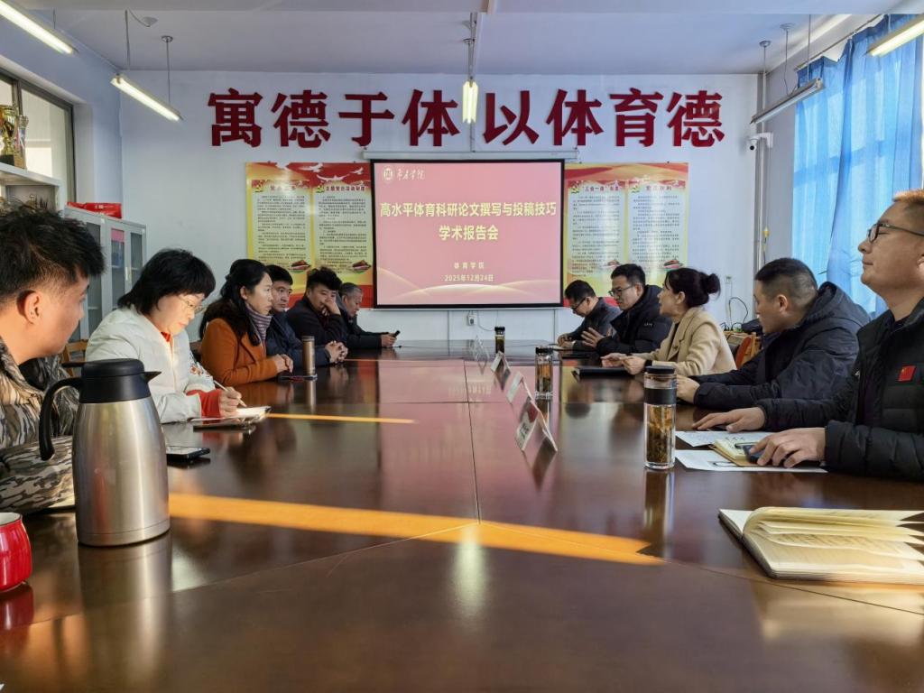12月24日下午,6776永利集团邀请山东理工大学6776永利集团高奎亭博士与盐城师范学院徐磊博士,在学院二楼会议室作题为《高水平体育科研论文撰写与投稿技巧》的专题学术报告。报告会由副院长周生旺主持,学院全体专任教师到场聆听。