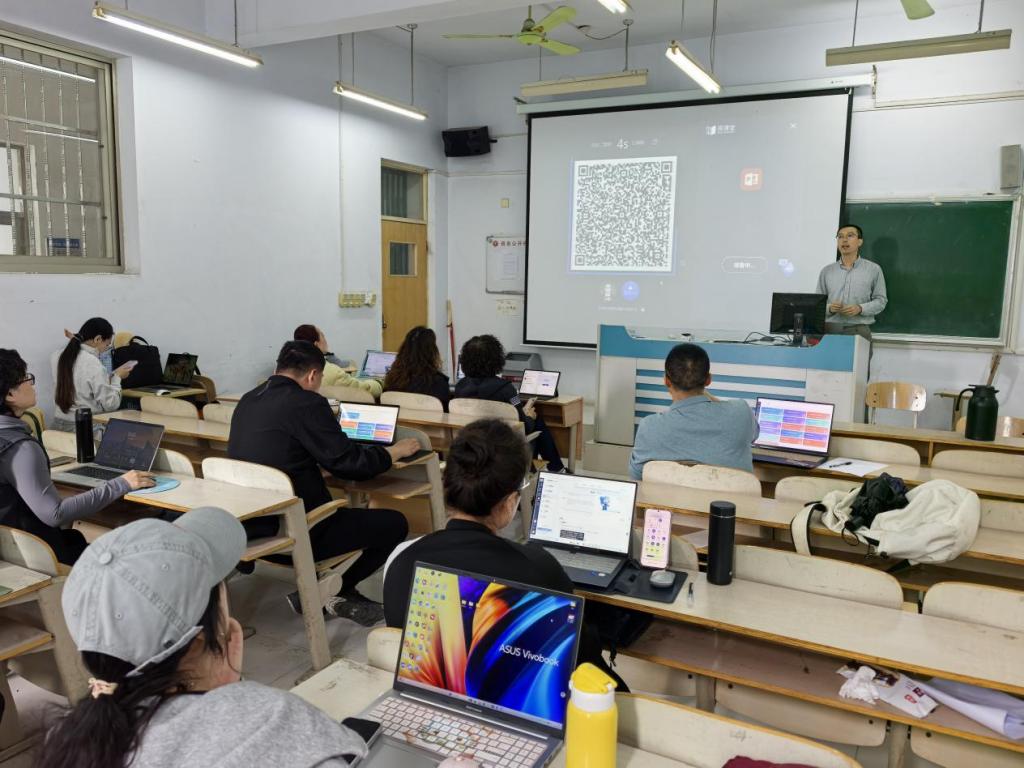 培训过程中,许老师围绕“雨课堂AI辅助授课”与“雨课堂AI辅助备课”两大核心模块,进行了系统讲解与现场实操演示。通过实际案例,许老师展示了如何利用雨课堂AI工具快速生成教学课件、设计课堂互动环节、实时分析学生学习数据,以及借助人工智能实现个性化教学反馈。在实操环节,参训教师亲身体验了雨课堂的各项AI功能,并就日常教学中遇到的如课堂互动设计困难、学情数据采集不全面、备课效率不高等实际问题,与许老师进行了深入交流。许老师逐一解答了教师们的疑问,并提供了针对性的优化建议。