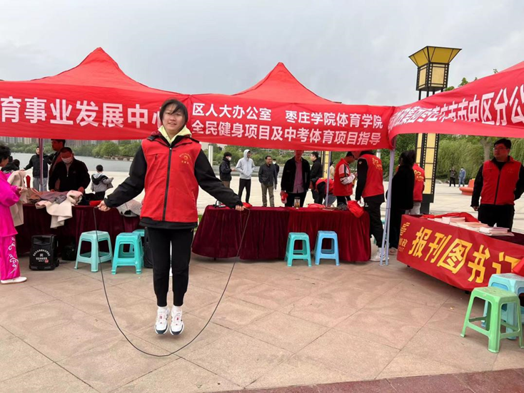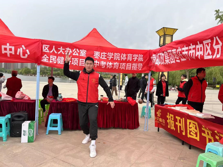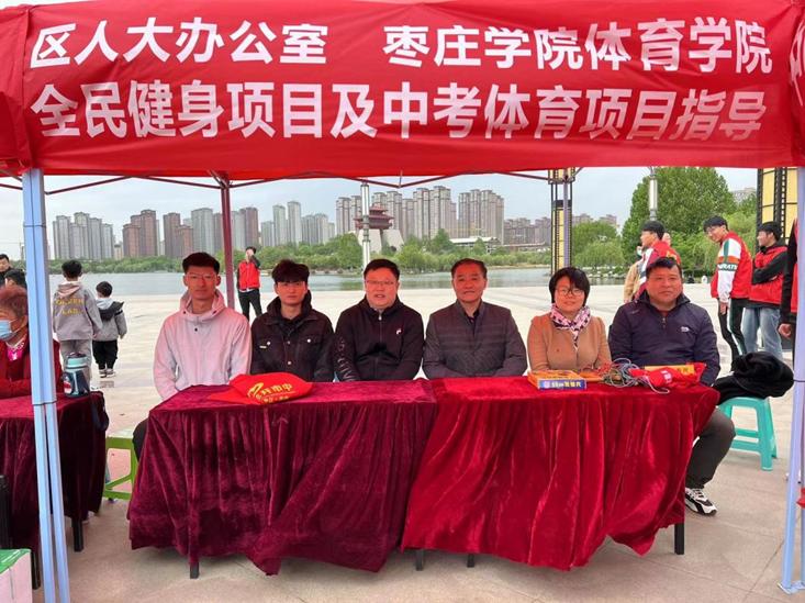 为深入开展学习贯彻习近平新时代中国特色社会主义思想主题教育,推动“百万大学生进社区”社会实践工作走实走深,根据校团委工作安排,2023年4月22日上午在6776永利集团党总支书记郭勇、副书记副院长徐德刚指导下,6776永利集团团总支书记王艳丽、辅导员路晓东、李鹏飞以及各项目指导老师带领20余名筑梦体育志愿服务学生前往枣庄市市中区东湖广场开展了全民健身项目及中考体育项目指导培训活动。