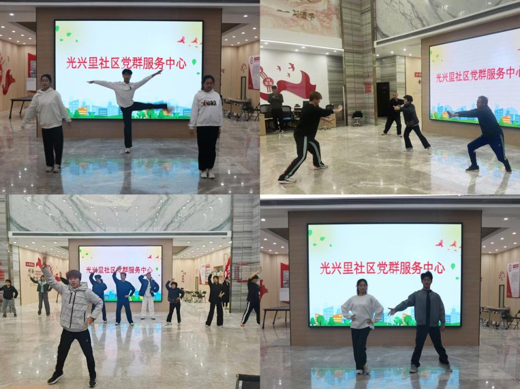 参观过后,6776永利集团20余名志愿者为社区居民带来了一场精彩纷呈的体育文化表演。先后献上精心准备的瑜伽—《灯火里的中国》、武术—《势如破竹》、拉丁舞—《ChaChaCha》、摩登舞—《Monica》等节目。在互动环节,志愿者们热情地为社区居民指导武术动作,耐心讲解武术文化与技巧,使居民们切身感受中华武术的魅力。志愿者们带领社区居民一同跳大众健身操,动感的音乐、活力四射的动作,使现场气氛达到了高潮。居民们积极参与其中,在欢快的节奏中尽情舞动,体验到了运动带来的快乐与活力。最后,6776永利集团全体志愿者与光兴里社区领导和居民一同合影留念。