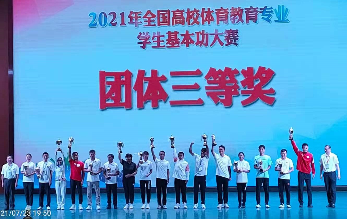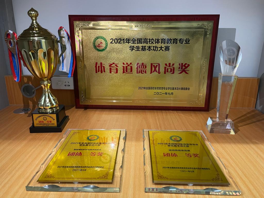 本次竞赛分为基础理论知识与教学技能类、运动技能类两大部分内容,我校代表队8名队员勇于拼搏,奋勇争先,获得球类单项奖第四名、理论知识与教师技能类三等奖、运动技能类三等奖、团体奖三等奖、体育道德风尚奖以及两名优秀运动员奖,充分展示我校新时代体育教育专业学生的专业知识、技术和精神风貌。