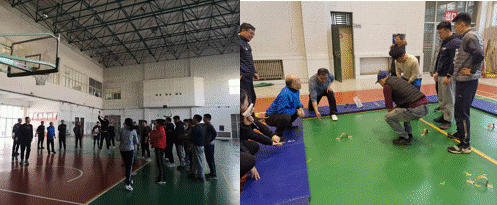 运动会共设置5个项目枪林弹雨(躲避飞盘)、定点投弹比武(以篮球代弹)、红军不怕远征难(指弹球)、炸碉堡(旱地冰壶)、三人突击队(三人制篮球),依托党支部将全体教职工分成4个参赛队依次进行。