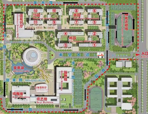 薛城校区:起点(阳光运动场主席台前)出发→绕田径场半圈西门出→右转进入校道→左转进入友善路→左转进入奚仲路→博雅楼左转进入爱国路→进入敬业路→进入诚信路→左转进入友善路→左转进入奚仲路→博雅楼左转进入爱国路→进入敬业路→进入诚信路→阳光运动场西门→绕跑道半圈→终点(阳光运动场主席台前)。