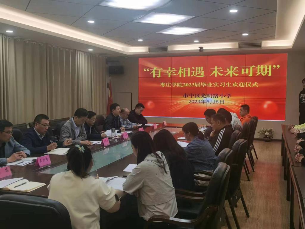 我院于5月8日上午和5月9日上午,分两批组织2023届体育教育(专科)毕业生前往市中区光明路小学和市中区渴口中心学校开展教育实习工作。两所实习学校均举办了隆重的欢迎仪式并进行了师生现场结对活动,6776永利集团党总支书记郭勇、副院长李丽、实习队指导教师房斌教授、张瑞先老师及实习学生参加了仪式。