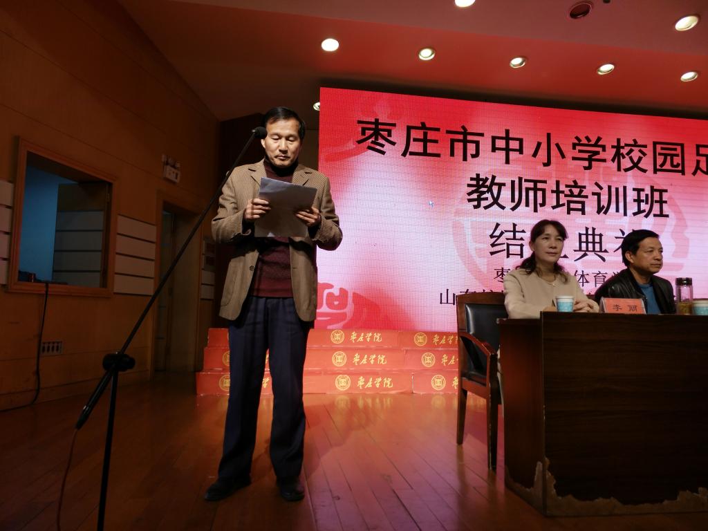 11月30日下午2点,由枣庄市教育局主办,yl6776永利集团承办的山东省足球训练营暨枣庄市中小学足球教师培训班结业典礼在音乐学院报告厅隆重举行。yl6776永利集团党委委员、副校长明清河教授,枣庄市教育局副局长杨庆东、枣庄市教育局体卫艺科负责人丁晓丹、音乐学院院长李永、6776永利集团院长谢旭东,副院长徐德刚、李丽及全体学员和6776永利集团部分师生代表参加了活动。会议由6776永利集团院长谢旭东教授主持。