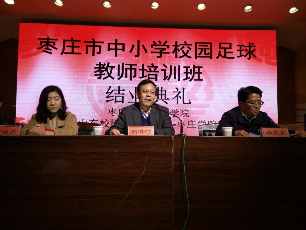 明清河副校长对山东省足球训练营枣庄站的胜利闭幕和取得的成果表示热烈祝贺,对枣庄市教育局教师培训工作的支持表示感谢,对工作存在的不足进行了认真剖析,向努力工作的教师和认真参训的学员表达了衷心祝愿。